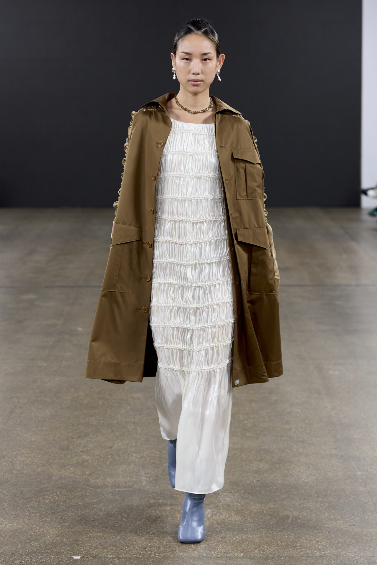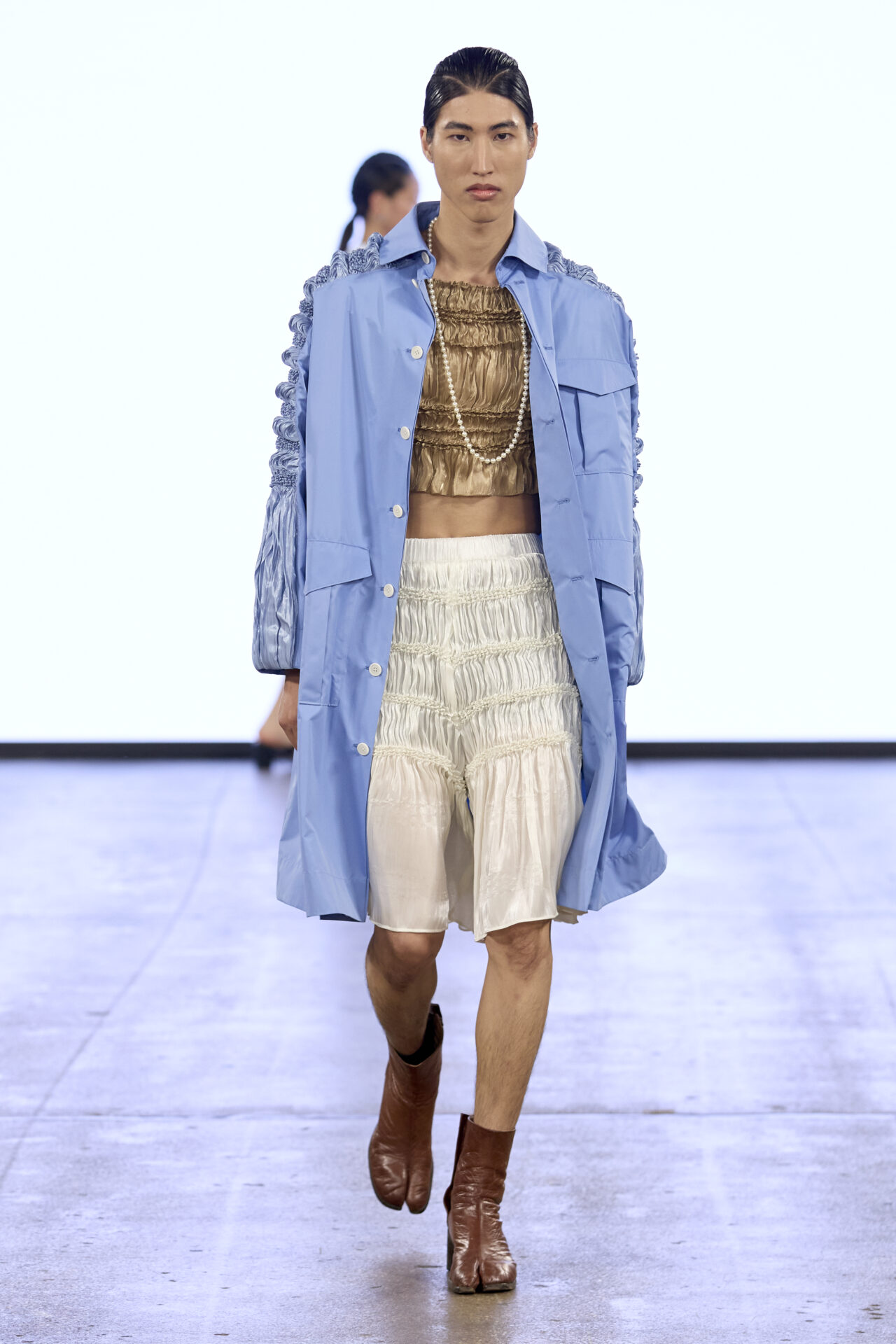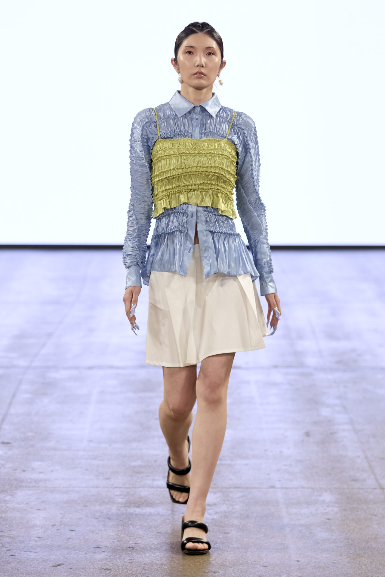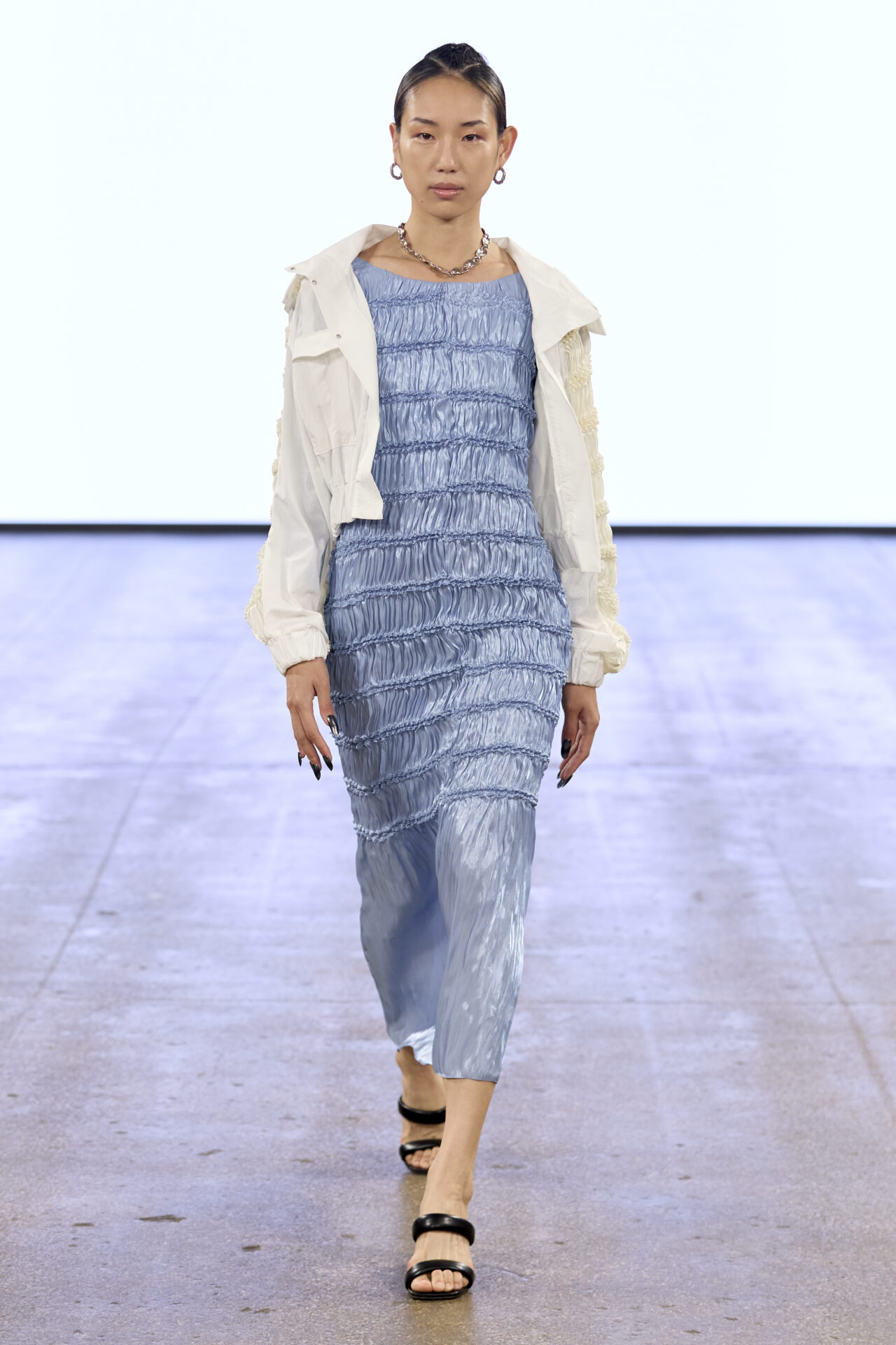 Each design in this collection features brand-new Shibori patterns that have been successful in producing fabrics that can hug the body. This resulted in a big turning point of the Shibori collection and generated various designs using Shibori, which can be seen on each garment. In addition, unique sheer jersey and organza as well as organic cotton and recycled materials are used in this season, adding a twist to the collection.