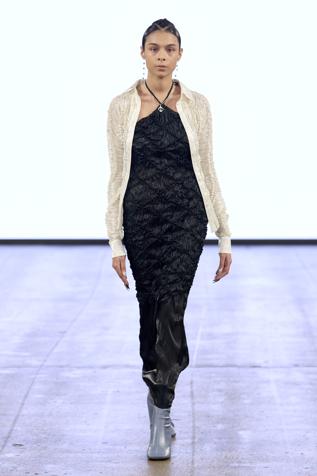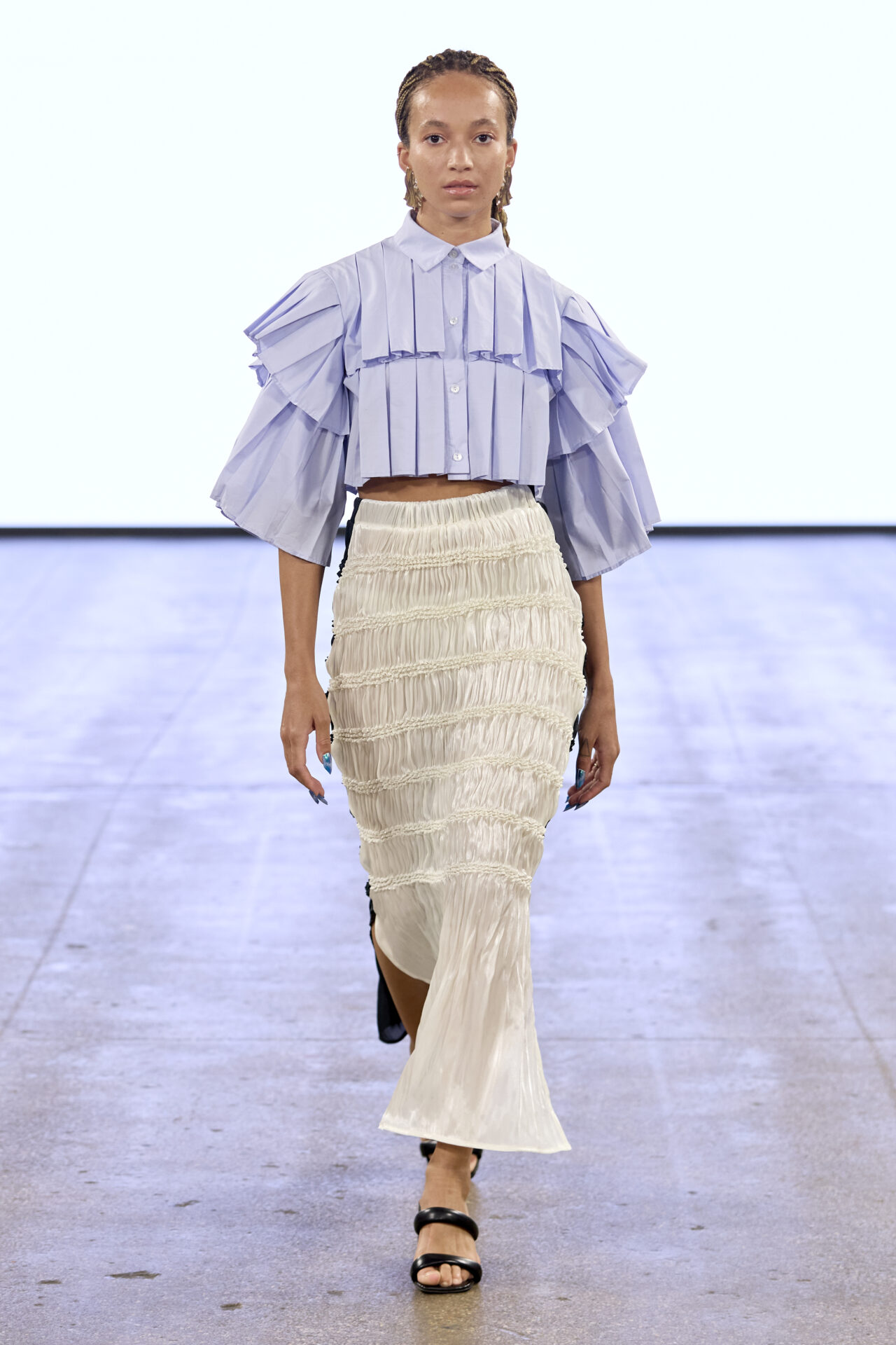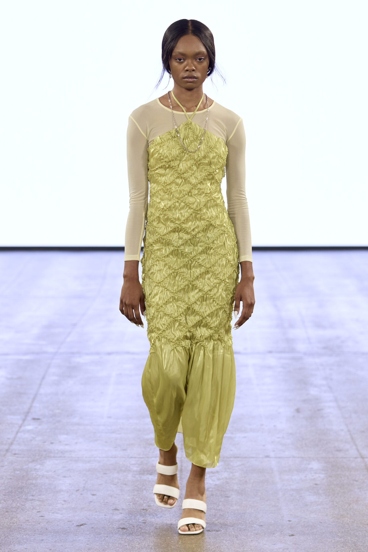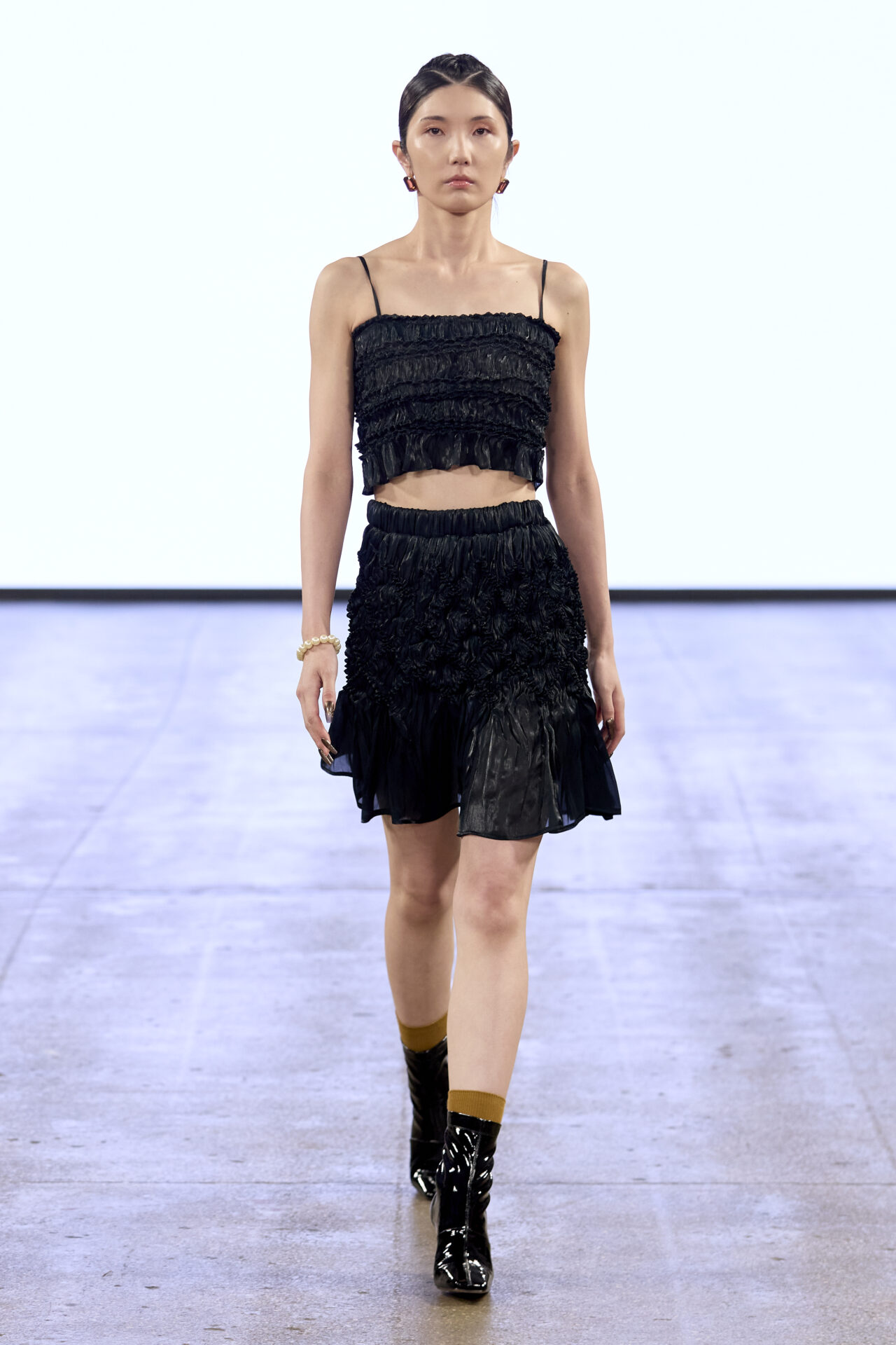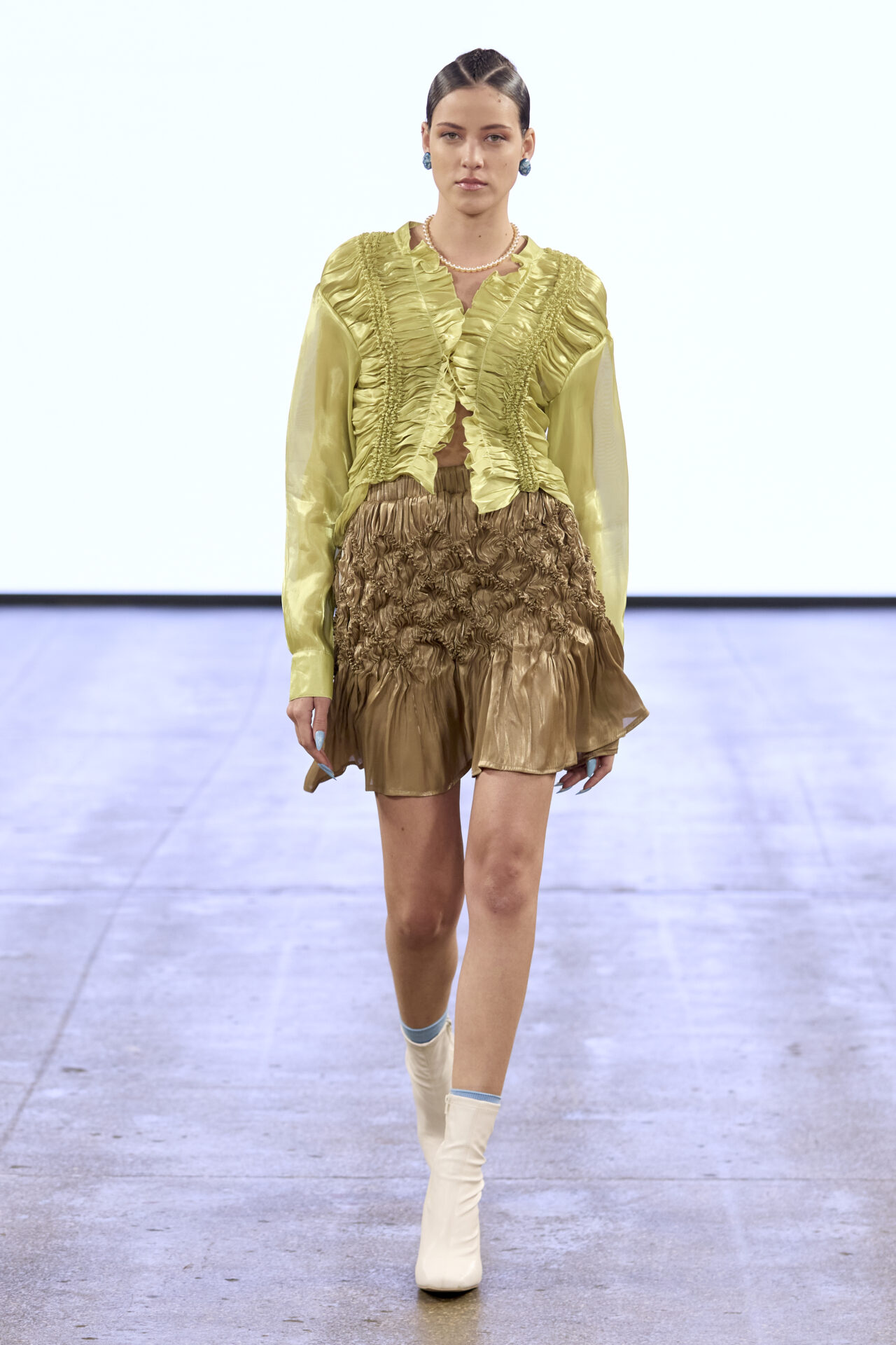 Each design in this collection features brand-new Shibori patterns that have been successful in producing fabrics that can hug the body. This resulted in a big turning point of the Shibori collection and generated various designs using Shibori, which can be seen on each garment. In addition, unique sheer jersey and organza as well as organic cotton and recycled materials are used in this season, adding a twist to the collection.