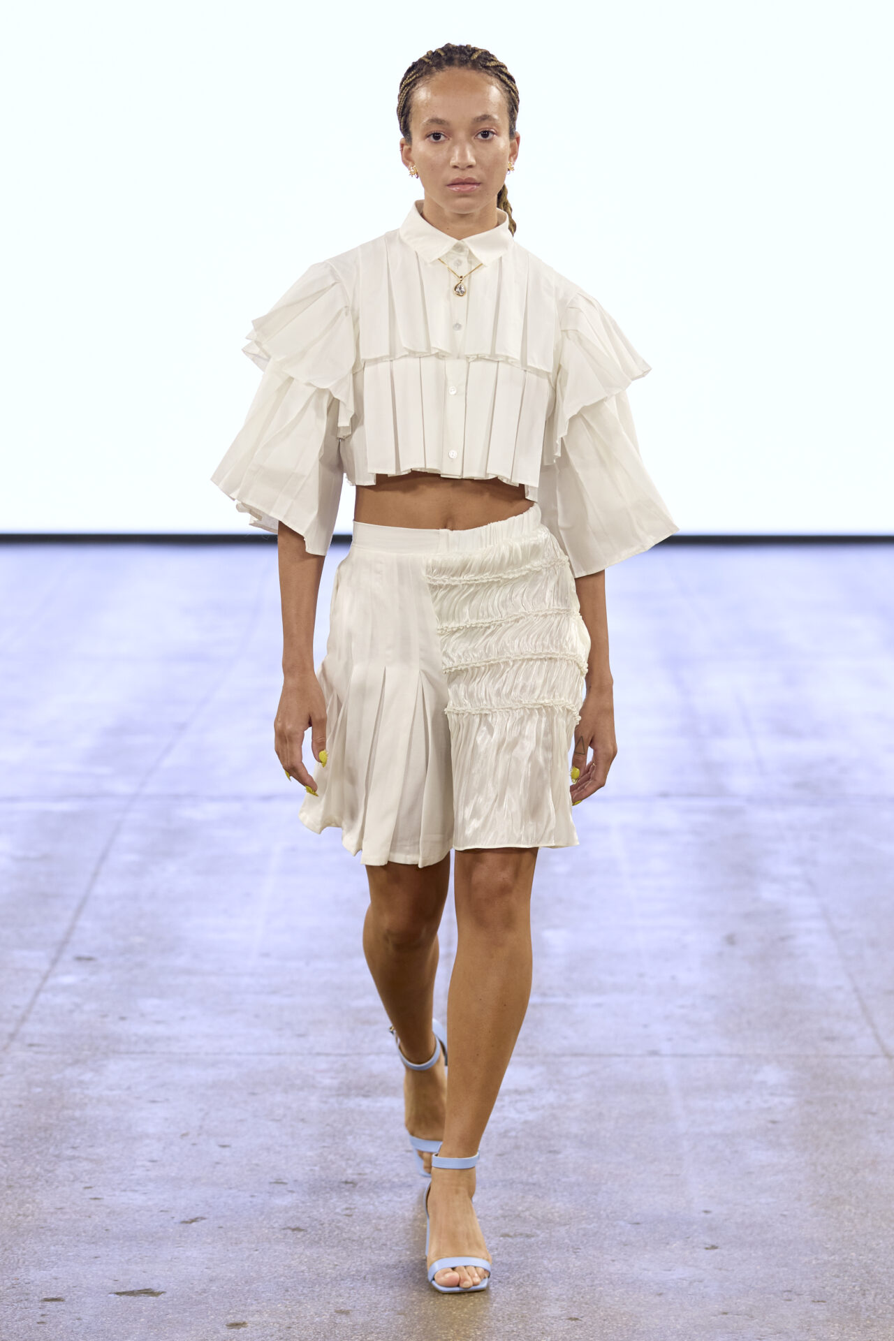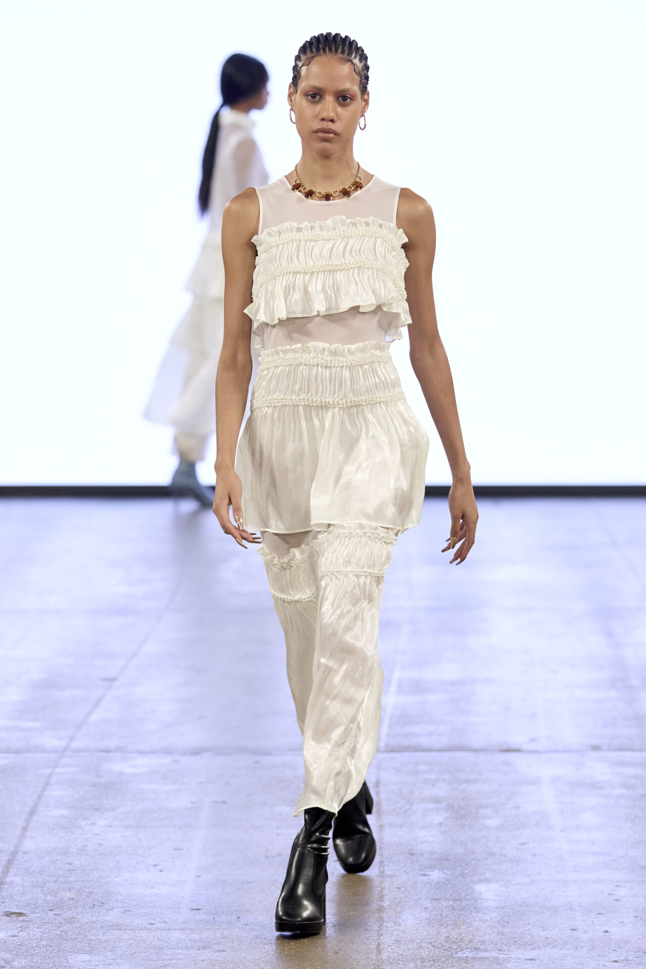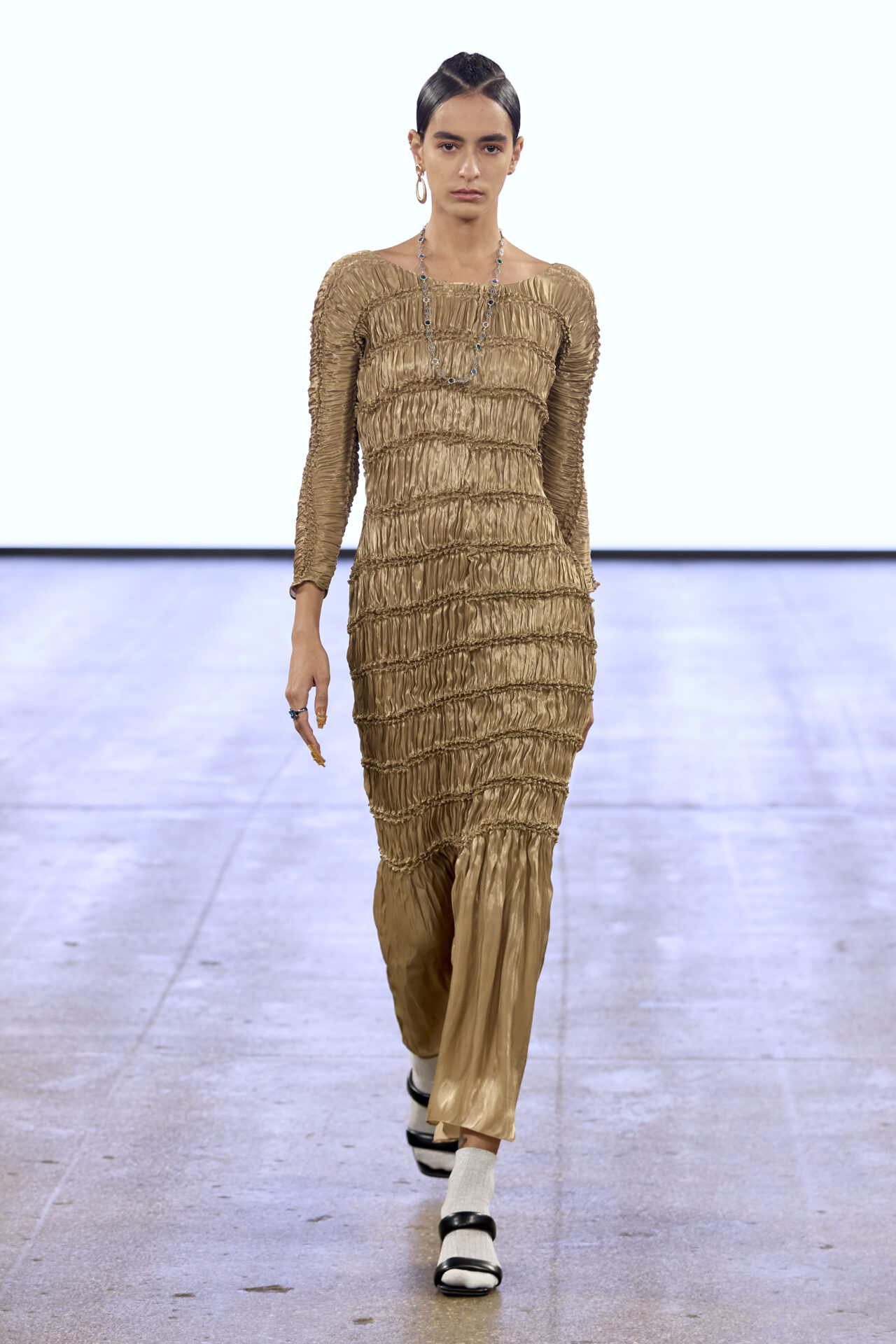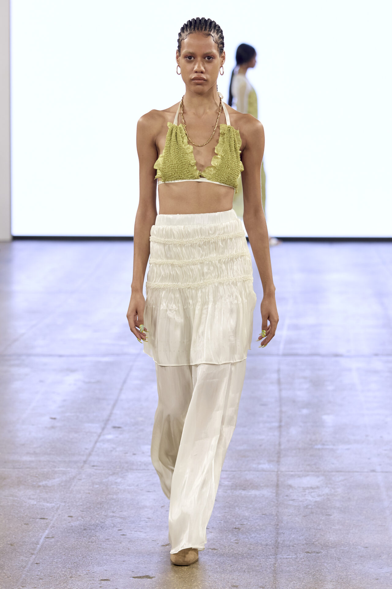 Each design in this collection features brand-new Shibori patterns that have been successful in producing fabrics that can hug the body. This resulted in a big turning point of the Shibori collection and generated various designs using Shibori, which can be seen on each garment. In addition, unique sheer jersey and organza as well as organic cotton and recycled materials are used in this season, adding a twist to the collection.