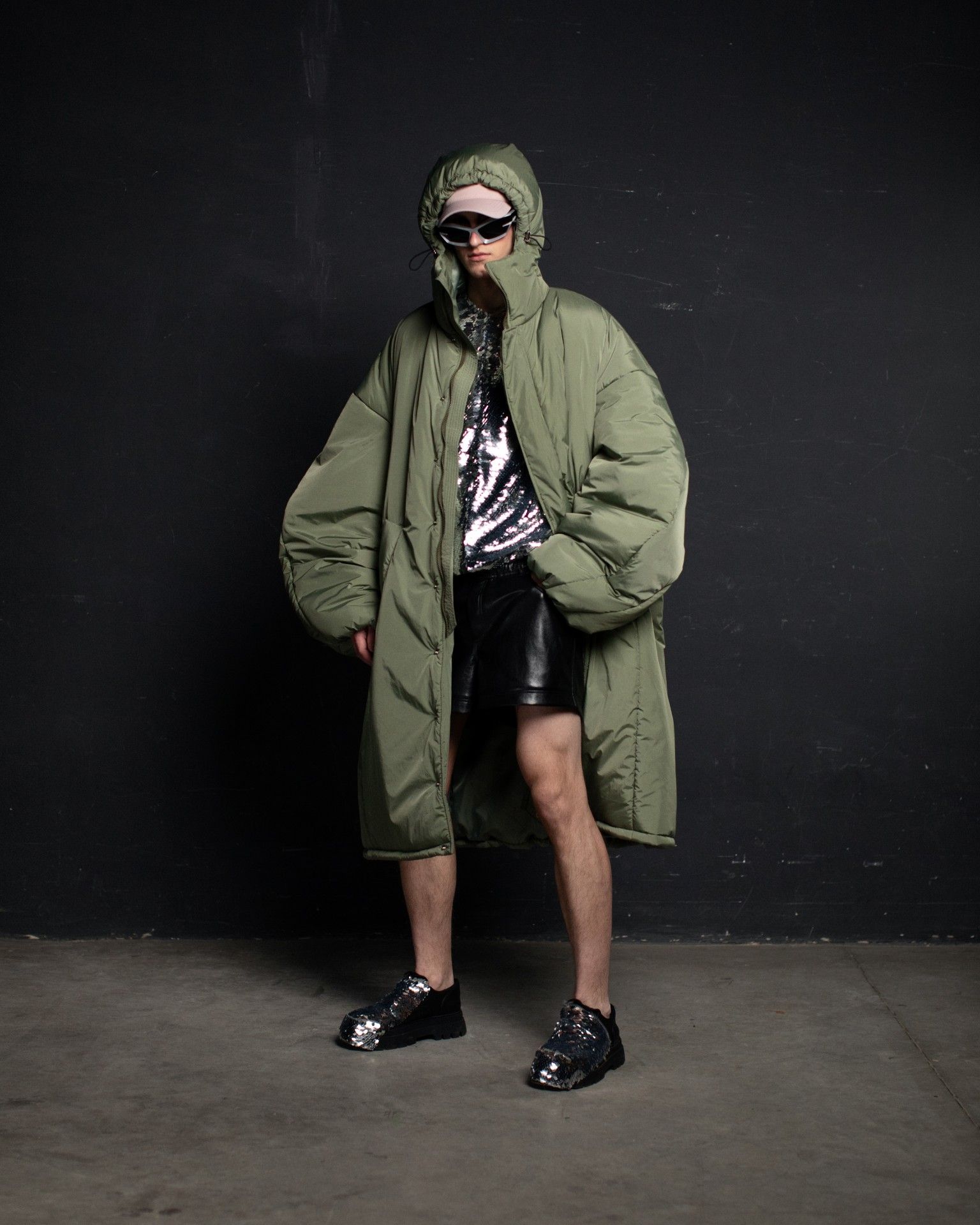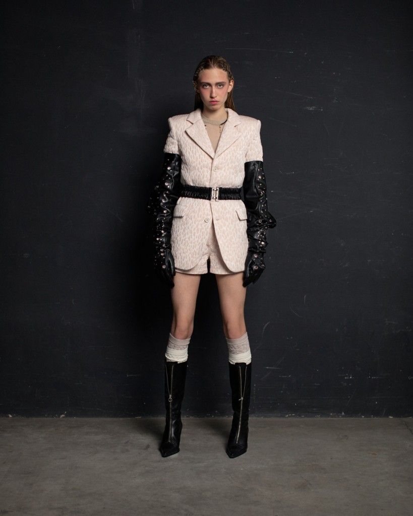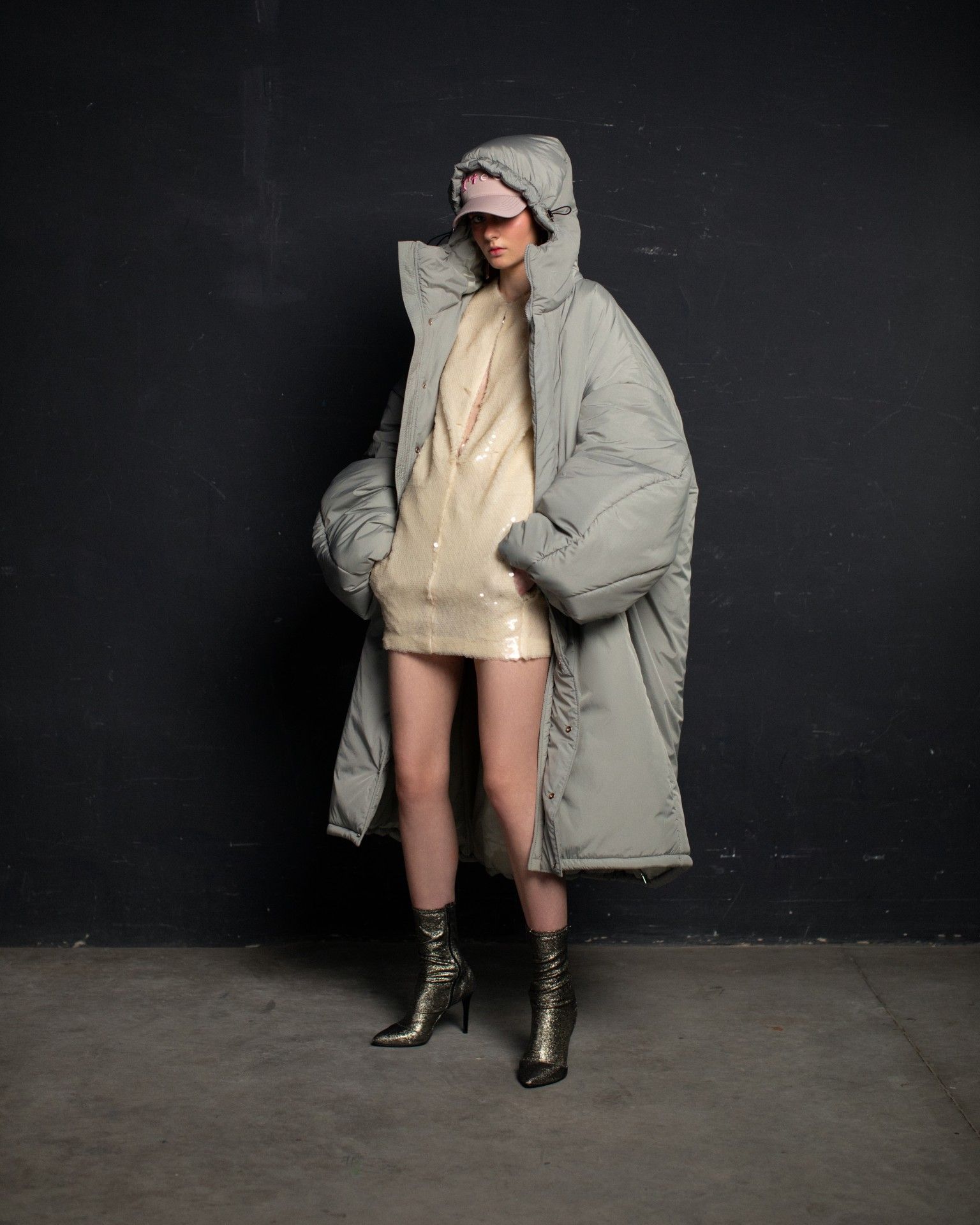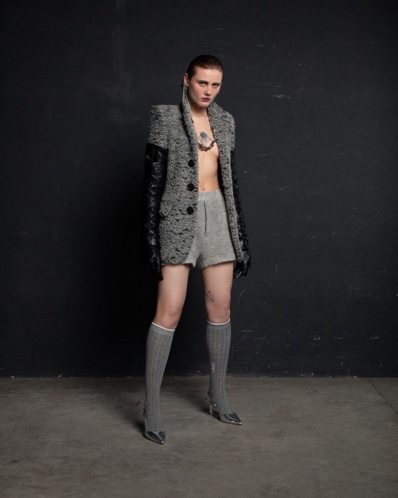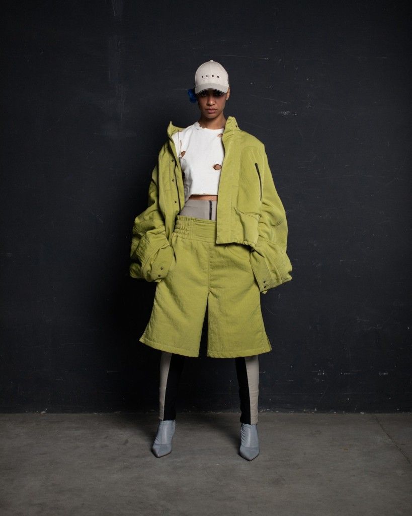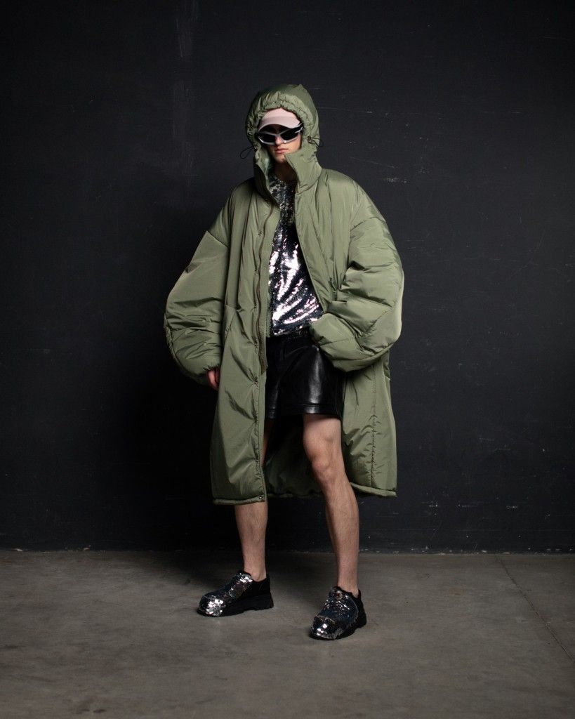 The collection unfolds in THEO’s distinctive stylistic approach, where extra-voluminous silhouettes symbolizing shelter and camouflage harmoniously intertwine with straight, narrow, elongated forms that broadcast the brand’s core aesthetic: gender fluidity. ‘THEO THE CREATOR’ surprises with an extravagant, modern twist — slim, tailored, rustically knitted, and jacquard blazers boasting pronounced 3D textures and deliberately accentuated straight shoulder lines that sharply reflect stylistic maturity. Brand’s signature TomBoy cut is revealed in the main block of the collection, evolving from a concise, cropped jacket with minimalist details in eco-leather and padded nylon to its classic version in fresh shades of baby pink and ripe pistachio, and finally unfolding in its essence in hyper-voluminous midi-length puffer jackets, where bulkiness and simultaneous lightness of form dominate. The collection captivates with finely selected luxurious textures from matte and dusted nylons, distressed denim, which, in combination with aged coarse and glossy soft ecoleather, pronounced hand knitting, faux fur, mirror sequins, and 3D jacquards, create a dramatic ensemble that unfolds even more dynamically thanks to a wide palette of achromatic tones, sprinkled with pale pink, patinated blue, shades of green, nude, and the audacity of gold and mirror silver.