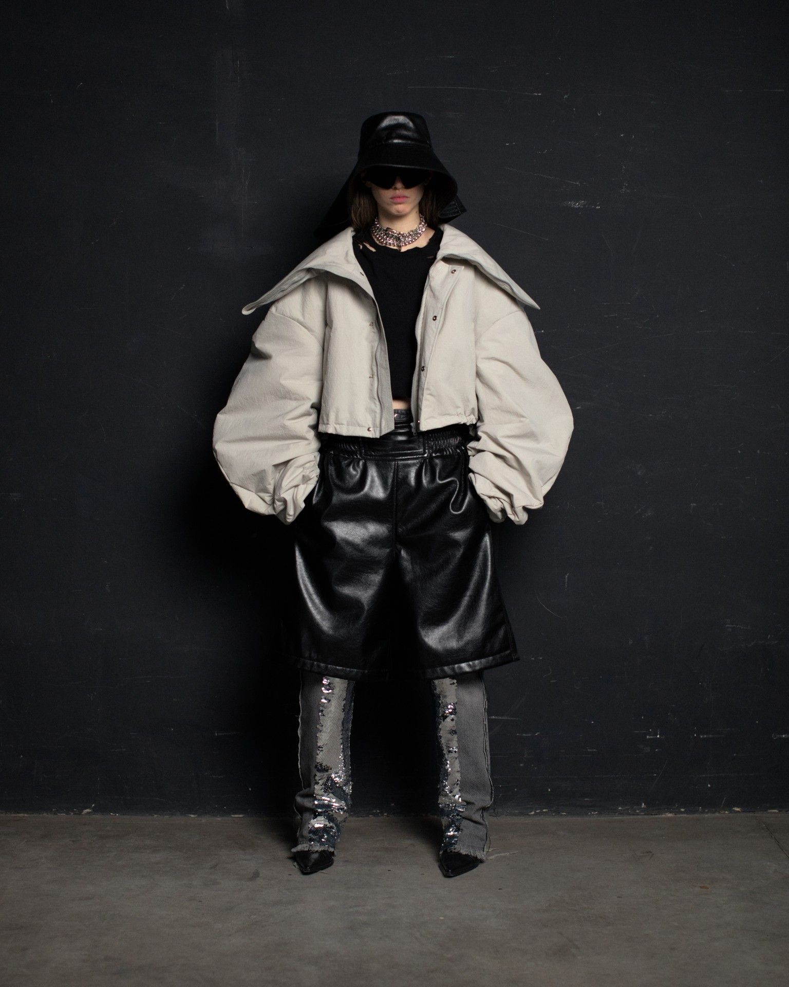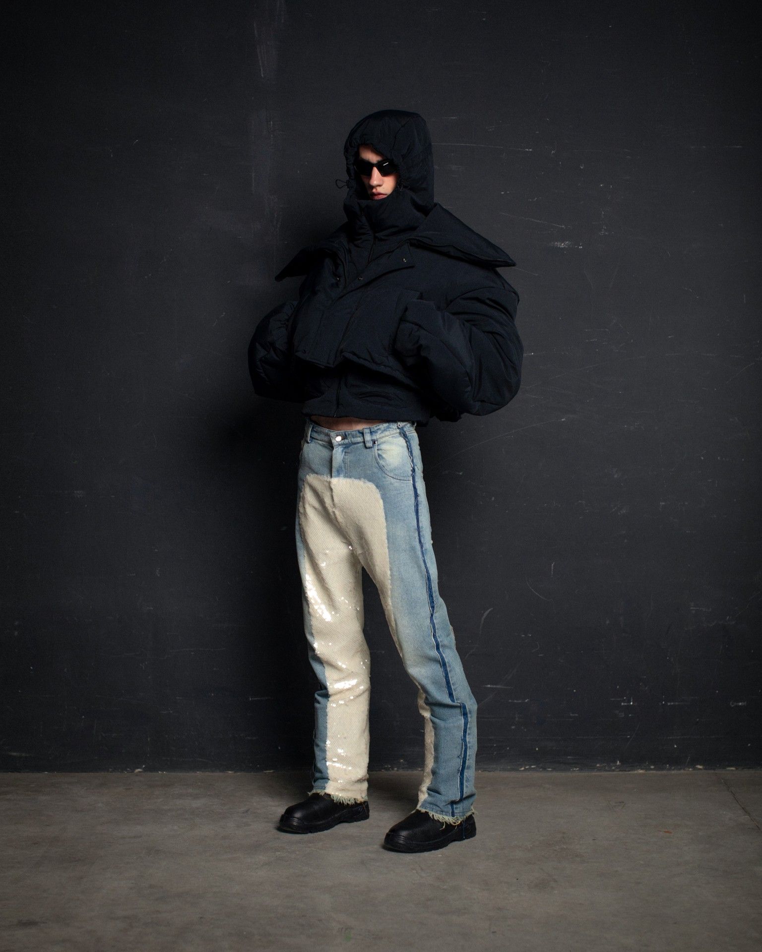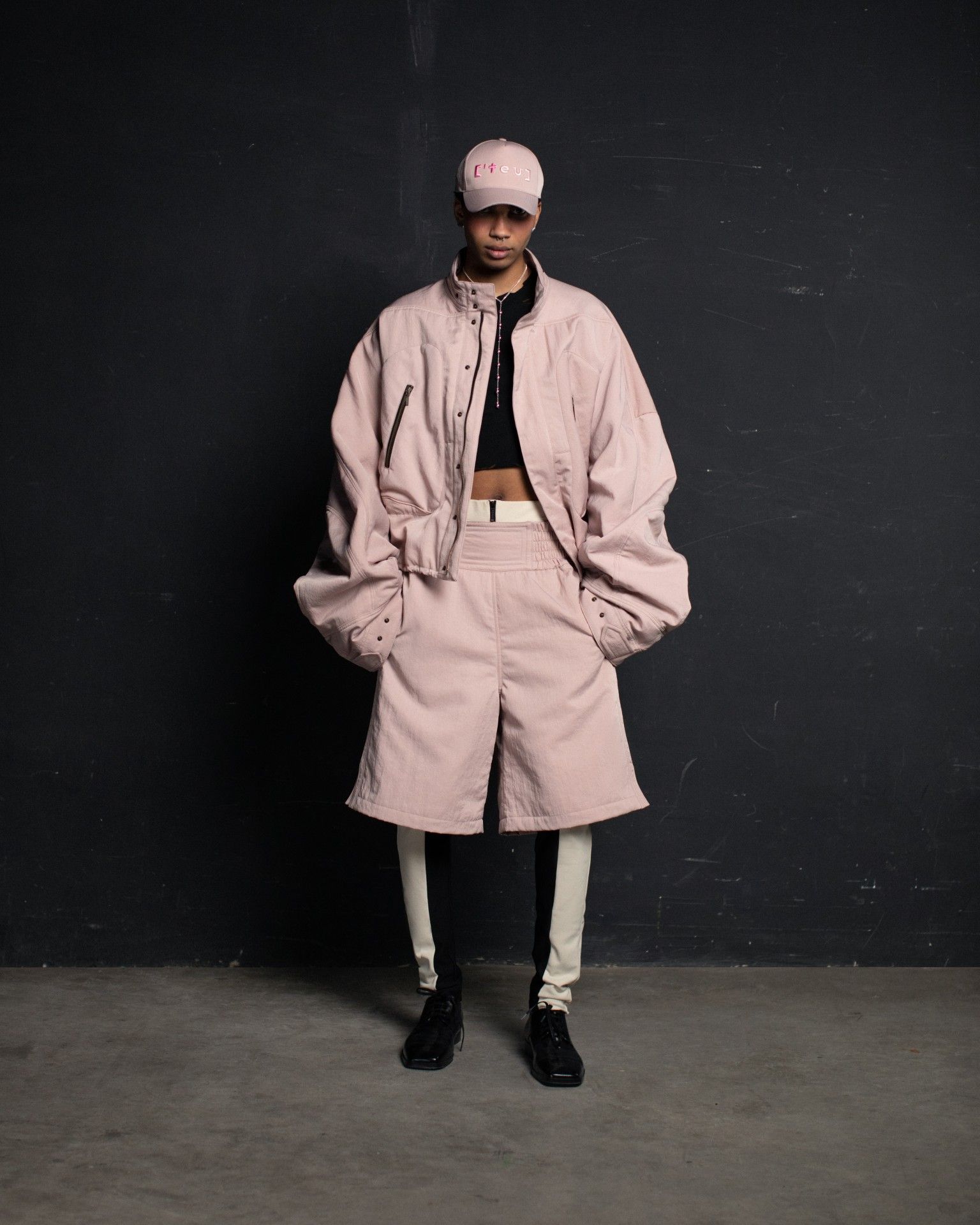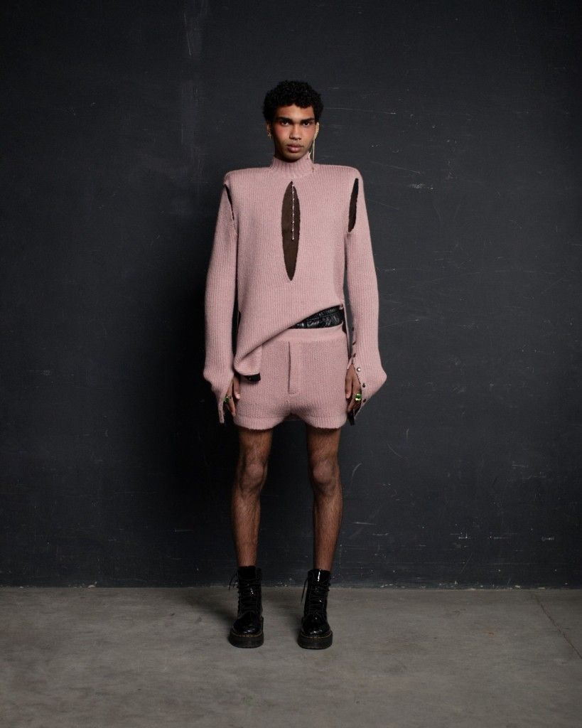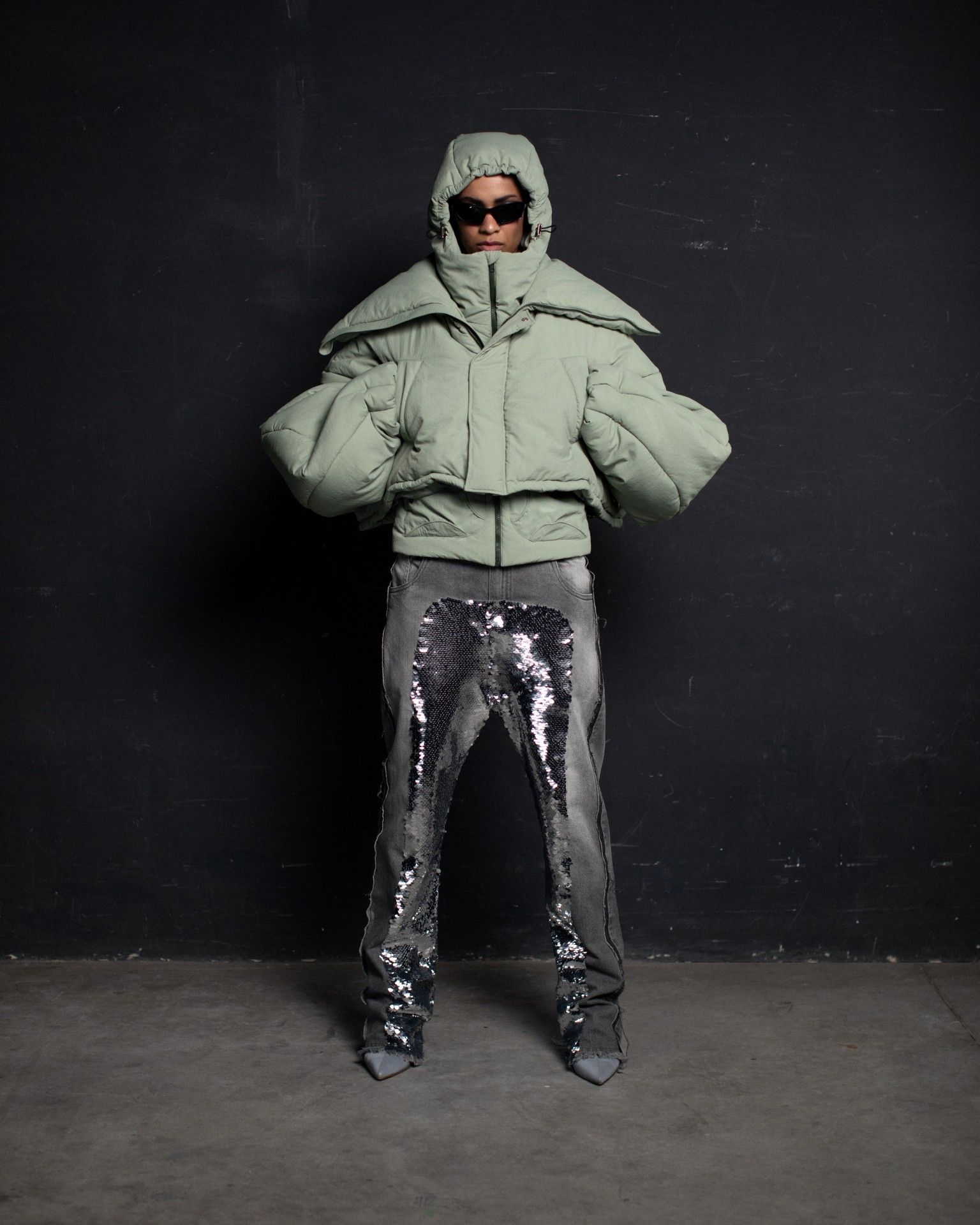 The collection unfolds in THEO’s distinctive stylistic approach, where extra-voluminous silhouettes symbolizing shelter and camouflage harmoniously intertwine with straight, narrow, elongated forms that broadcast the brand’s core aesthetic: gender fluidity. ‘THEO THE CREATOR’ surprises with an extravagant, modern twist — slim, tailored, rustically knitted, and jacquard blazers boasting pronounced 3D textures and deliberately accentuated straight shoulder lines that sharply reflect stylistic maturity. Brand’s signature TomBoy cut is revealed in the main block of the collection, evolving from a concise, cropped jacket with minimalist details in eco-leather and padded nylon to its classic version in fresh shades of baby pink and ripe pistachio, and finally unfolding in its essence in hyper-voluminous midi-length puffer jackets, where bulkiness and simultaneous lightness of form dominate. The collection captivates with finely selected luxurious textures from matte and dusted nylons, distressed denim, which, in combination with aged coarse and glossy soft ecoleather, pronounced hand knitting, faux fur, mirror sequins, and 3D jacquards, create a dramatic ensemble that unfolds even more dynamically thanks to a wide palette of achromatic tones, sprinkled with pale pink, patinated blue, shades of green, nude, and the audacity of gold and mirror silver.