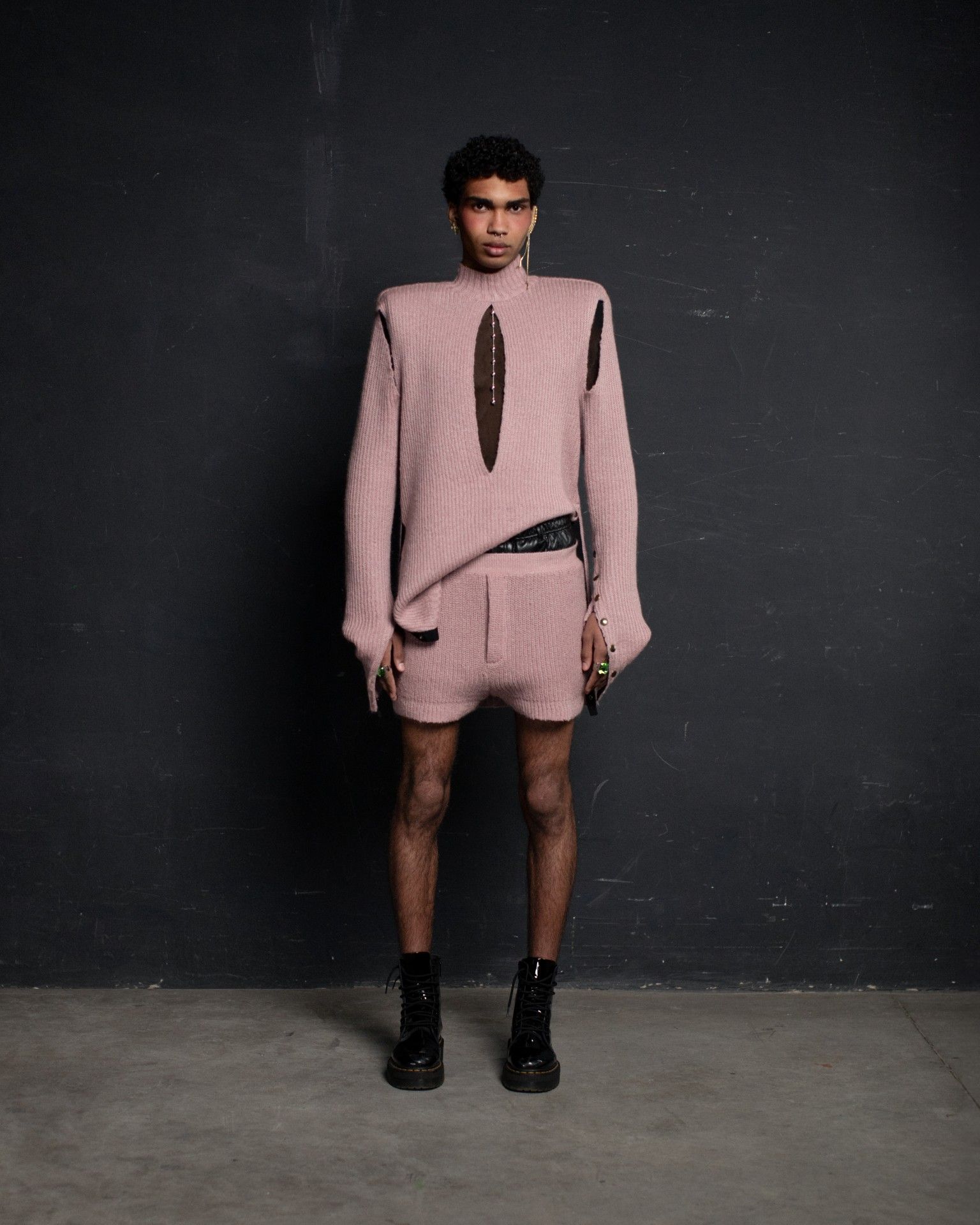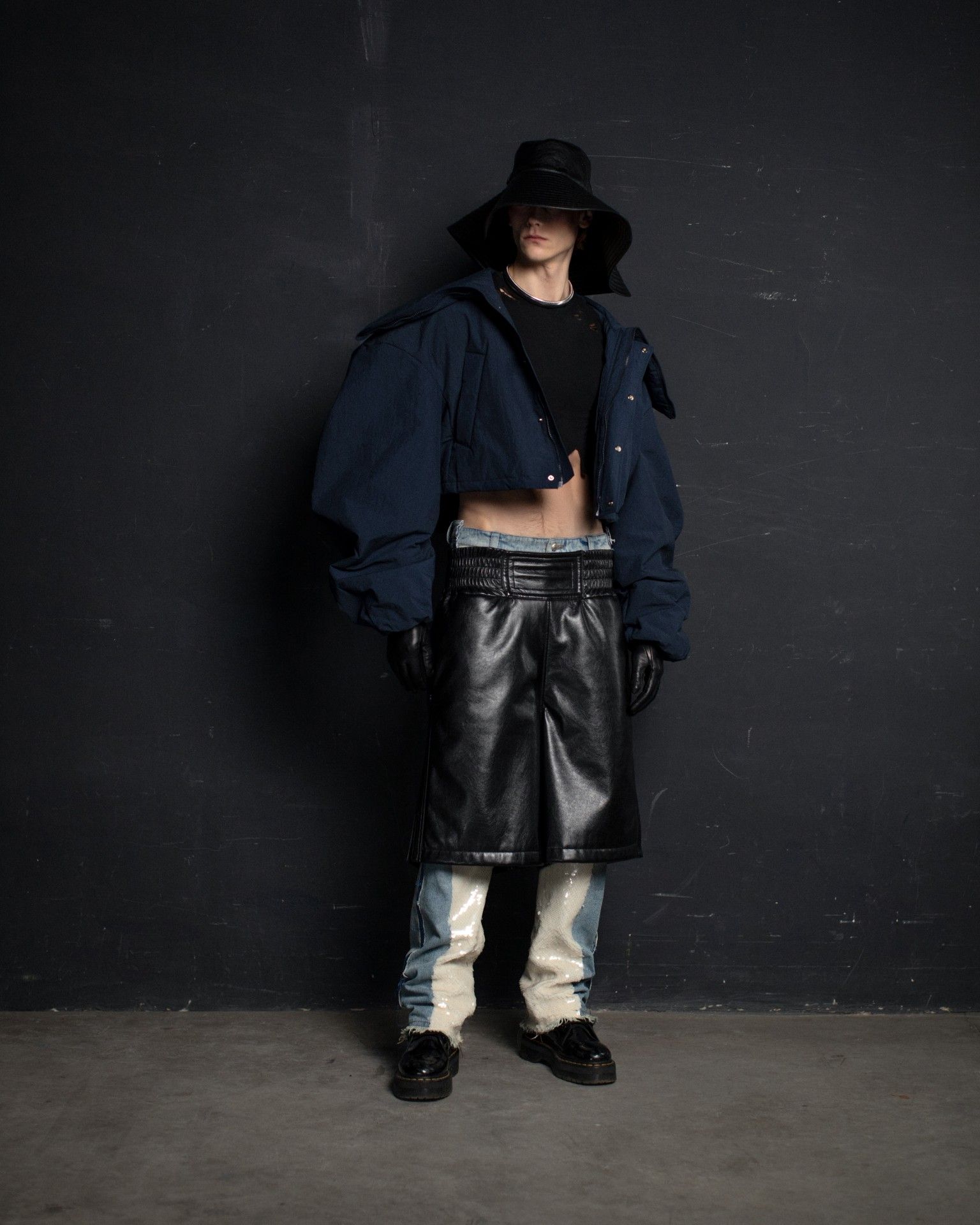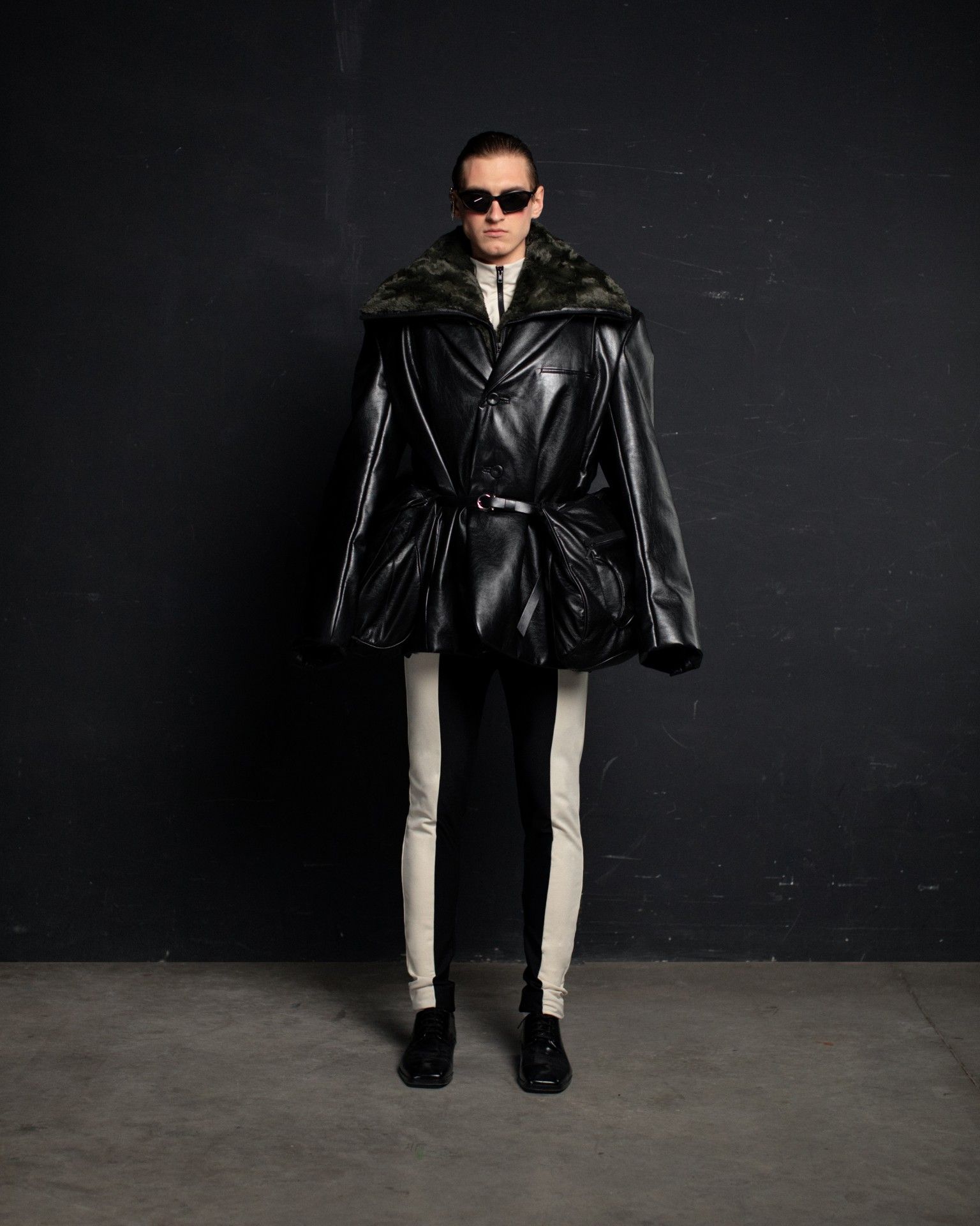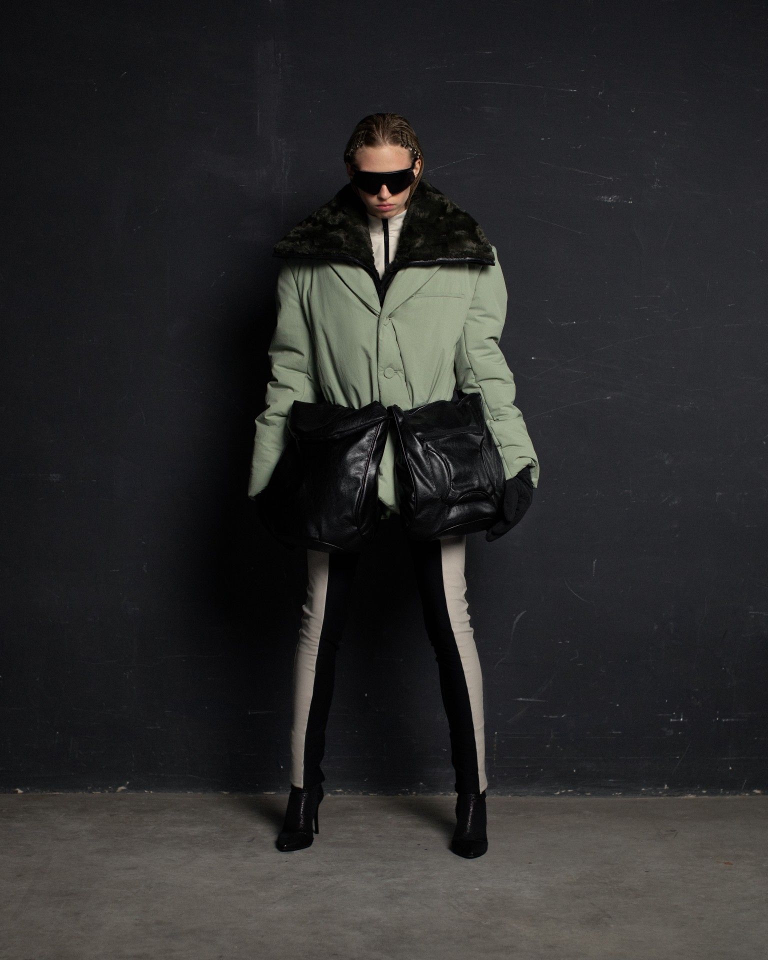 The collection unfolds in THEO’s distinctive stylistic approach, where extra-voluminous silhouettes symbolizing shelter and camouflage harmoniously intertwine with straight, narrow, elongated forms that broadcast the brand’s core aesthetic: gender fluidity. ‘THEO THE CREATOR’ surprises with an extravagant, modern twist — slim, tailored, rustically knitted, and jacquard blazers boasting pronounced 3D textures and deliberately accentuated straight shoulder lines that sharply reflect stylistic maturity. Brand’s signature TomBoy cut is revealed in the main block of the collection, evolving from a concise, cropped jacket with minimalist details in eco-leather and padded nylon to its classic version in fresh shades of baby pink and ripe pistachio, and finally unfolding in its essence in hyper-voluminous midi-length puffer jackets, where bulkiness and simultaneous lightness of form dominate. The collection captivates with finely selected luxurious textures from matte and dusted nylons, distressed denim, which, in combination with aged coarse and glossy soft ecoleather, pronounced hand knitting, faux fur, mirror sequins, and 3D jacquards, create a dramatic ensemble that unfolds even more dynamically thanks to a wide palette of achromatic tones, sprinkled with pale pink, patinated blue, shades of green, nude, and the audacity of gold and mirror silver.