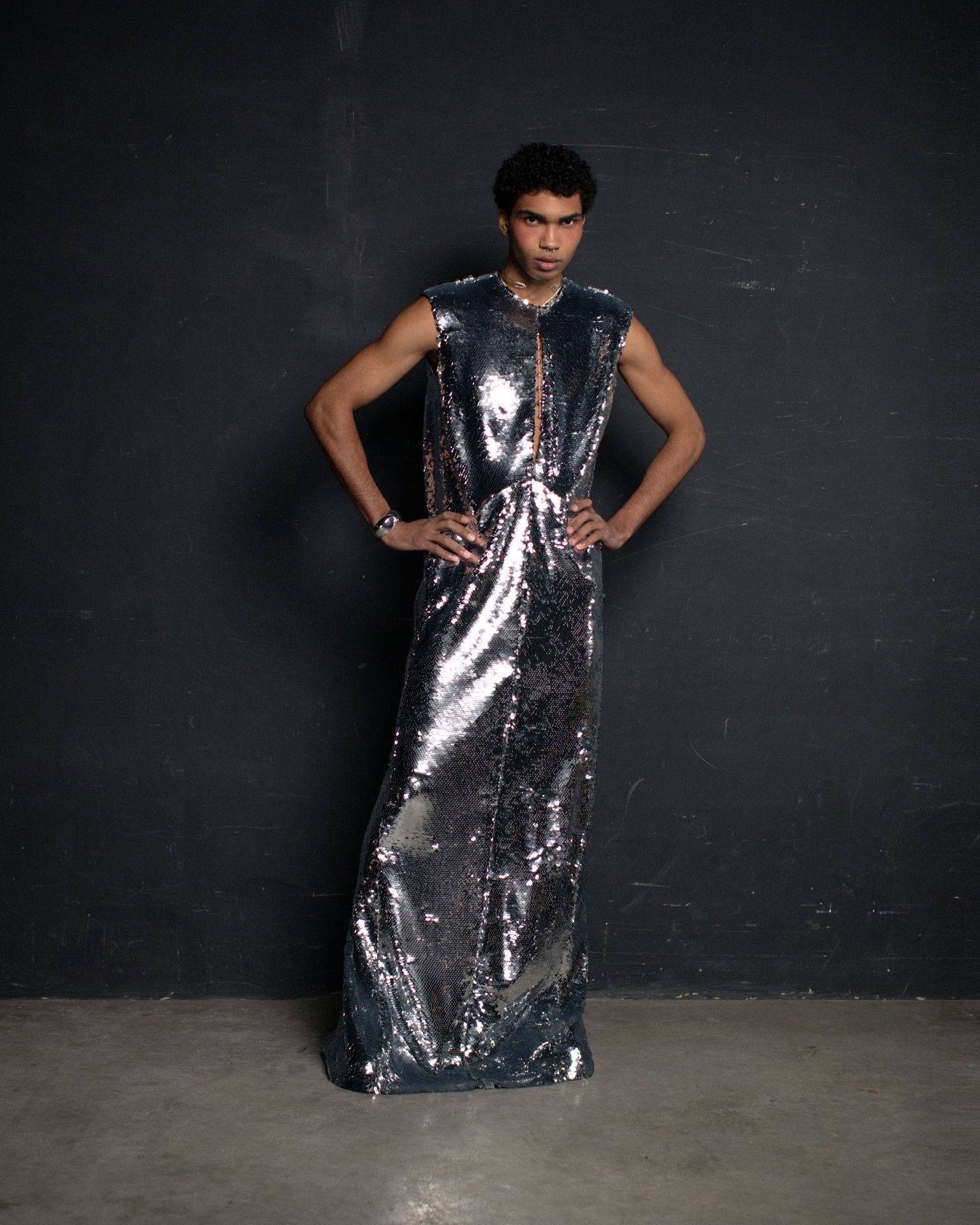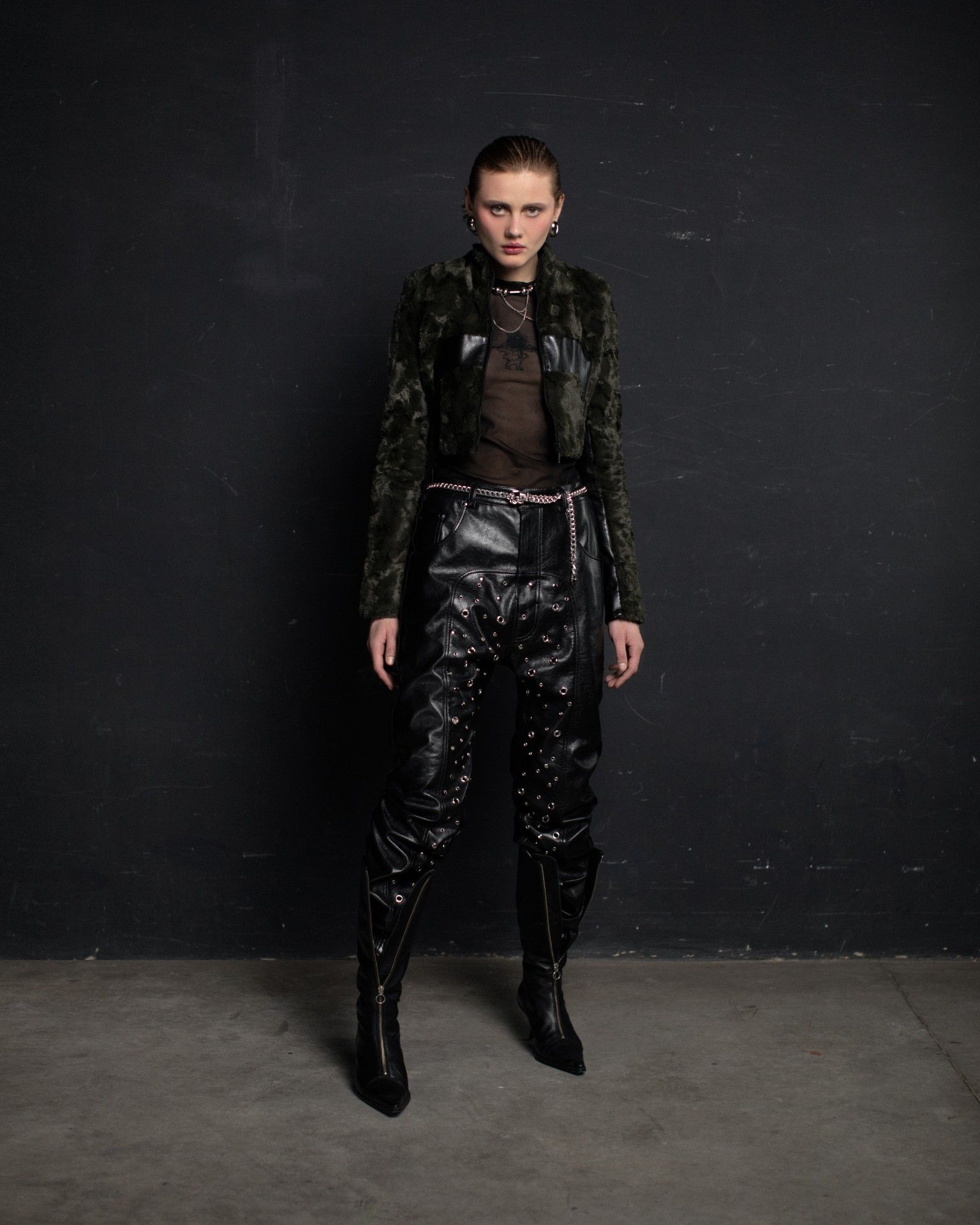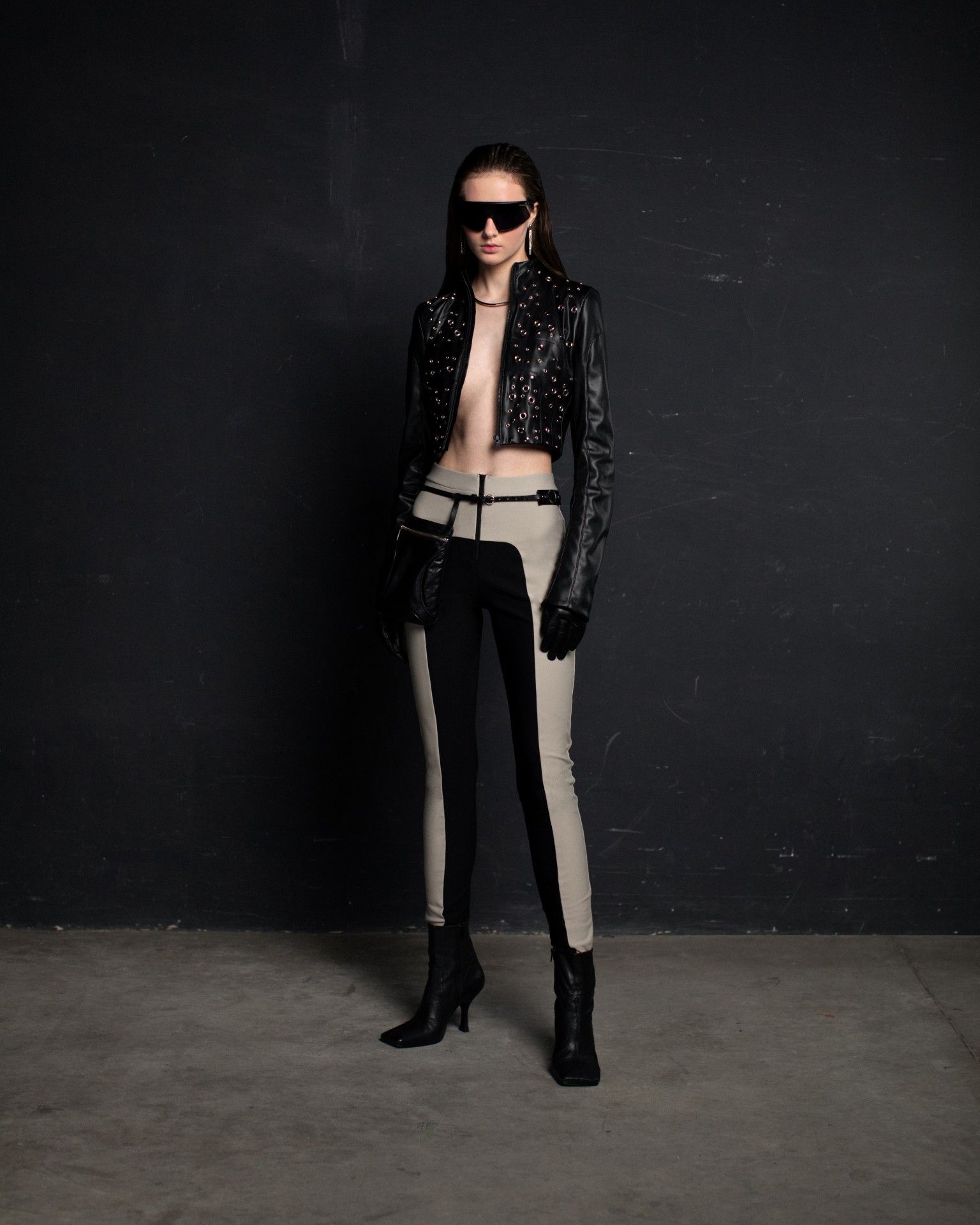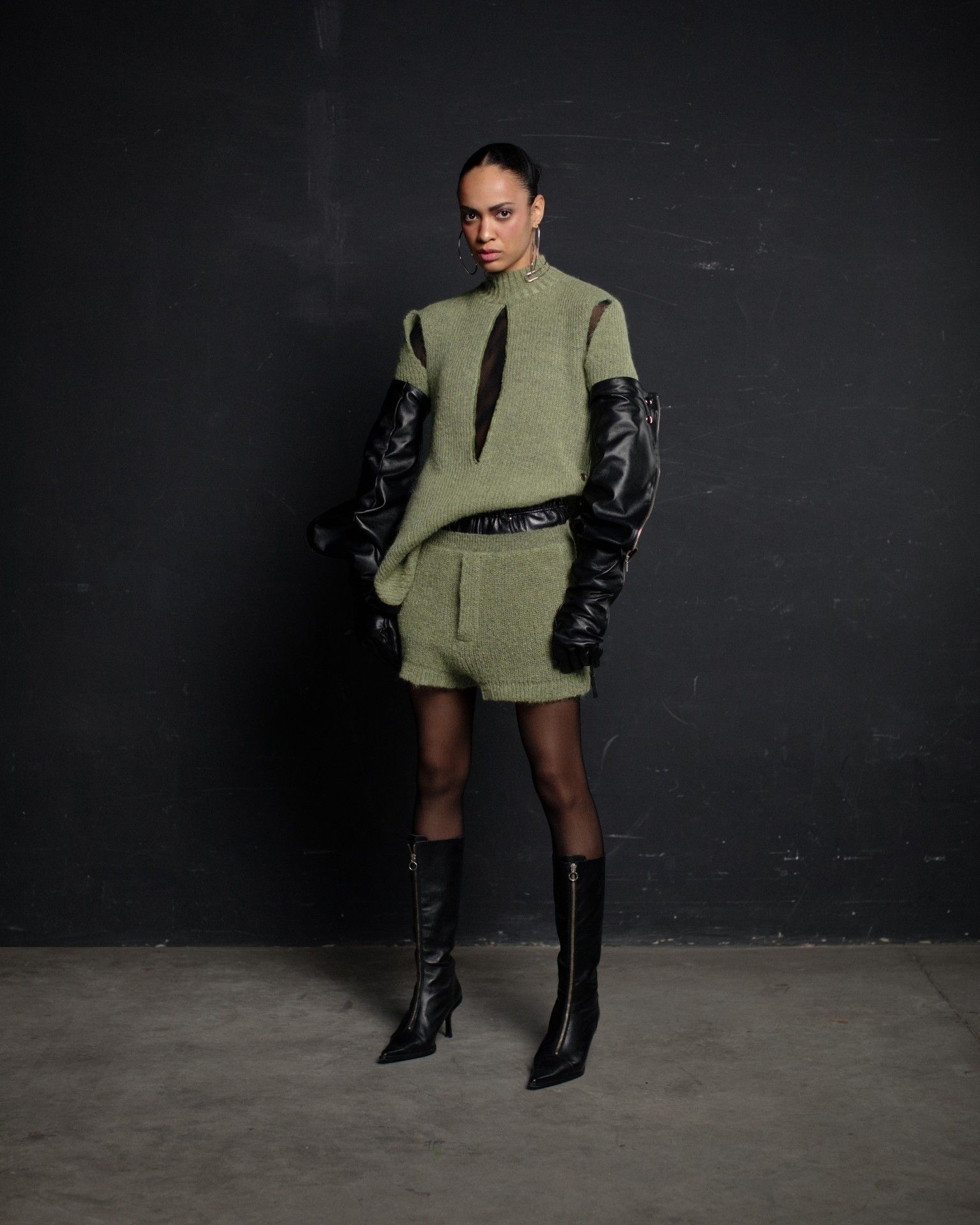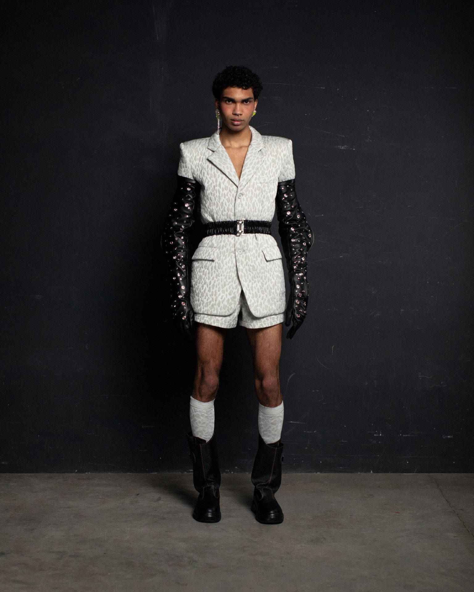 The collection unfolds in THEO’s distinctive stylistic approach, where extra-voluminous silhouettes symbolizing shelter and camouflage harmoniously intertwine with straight, narrow, elongated forms that broadcast the brand’s core aesthetic: gender fluidity. ‘THEO THE CREATOR’ surprises with an extravagant, modern twist — slim, tailored, rustically knitted, and jacquard blazers boasting pronounced 3D textures and deliberately accentuated straight shoulder lines that sharply reflect stylistic maturity. Brand’s signature TomBoy cut is revealed in the main block of the collection, evolving from a concise, cropped jacket with minimalist details in eco-leather and padded nylon to its classic version in fresh shades of baby pink and ripe pistachio, and finally unfolding in its essence in hyper-voluminous midi-length puffer jackets, where bulkiness and simultaneous lightness of form dominate. The collection captivates with finely selected luxurious textures from matte and dusted nylons, distressed denim, which, in combination with aged coarse and glossy soft ecoleather, pronounced hand knitting, faux fur, mirror sequins, and 3D jacquards, create a dramatic ensemble that unfolds even more dynamically thanks to a wide palette of achromatic tones, sprinkled with pale pink, patinated blue, shades of green, nude, and the audacity of gold and mirror silver.